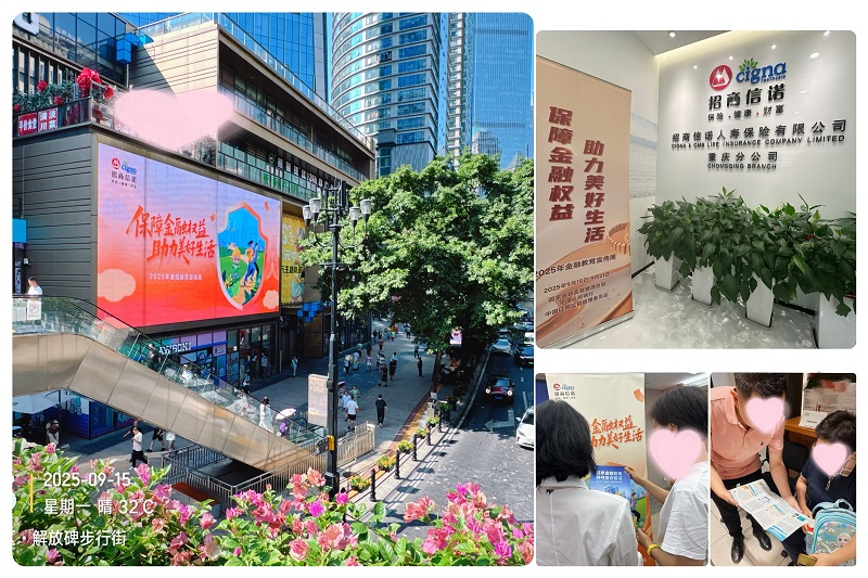 招商信诺重庆分公司通过在渝中区解放碑步行街核心商圈户外LED屏高频轮播简明生动的宣传口号,积极营造“保障金融权益,助力美好生活”的金融教育宣传周浓厚氛围,助力公众提升金融素养与风险防范能力。线下在职场办公场所摆放主题资料,联合社区及企业机构开展线上线下一体化宣教,通过案例解析与互动问答等形式,强化消费者权益保护意识,传递理性维权理念。