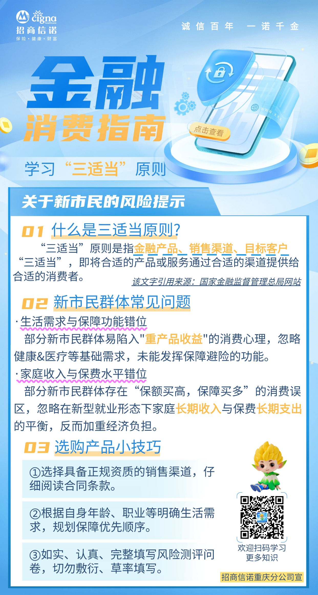 新市民朋友看过来:了解三适当原则,保护自身权益。招商信诺重庆分公司宣。