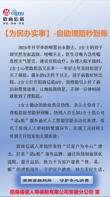 【为民办实事】-自助理赔秒到账 ——招商信诺安徽分公司