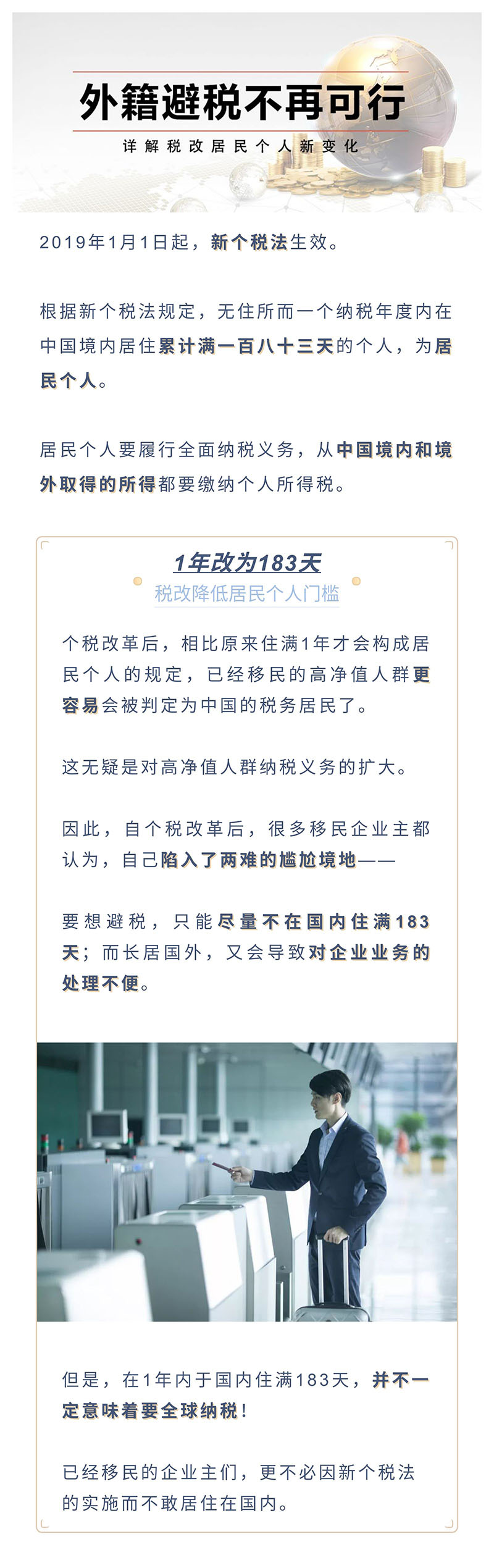 摘要:2019年1月1日起,新个税法生效,外籍避税不再可行!